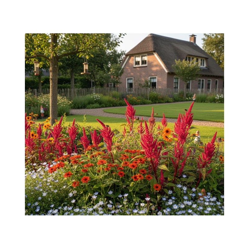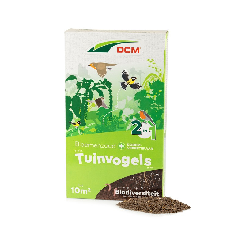 DCM Bloemenmengsel Tuinvogels bevat ook meer dan 20 bloemenzaden, zoals de rode Kattenstaartamarant, Mexicaanse zonnebloem en Bosliefje. Het mengsel trekt tuinvogels aan, die voorzien worden van voedsel.